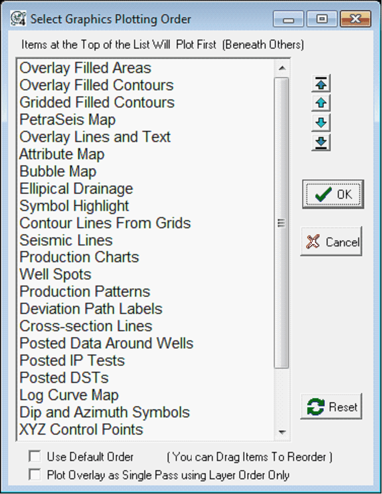 The Select Graphics Plotting Order Tool Reset - This option resets the items to the default graphics plotting order. This is generally a good choice for most maps. Use Default Order - This option overrides the graphics plotting order list, and uses a default plotting order. Plot Overlay as Single Pass using Layer Order Only - This option draws every layer in the overlay at one time. This option overrides the order of overlay-specific items like "Overlay Filled Areas" and "Overlay Filled Contours." |