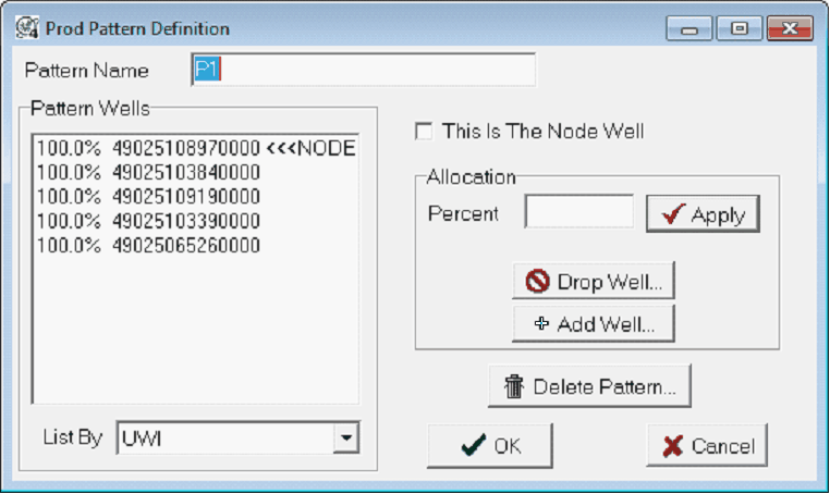 or Pattern Properties - This option opens the Prod Pattern Definition tool (see below), which can view or modify the pattern's well list and production allocation.