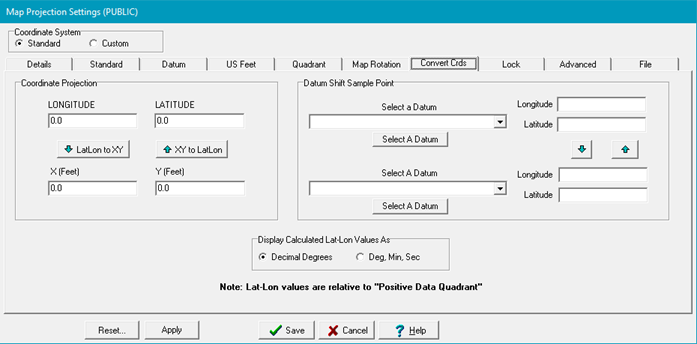 The Convert Crds tab is a quick way to convert specific points on a map into different forms and datums. More specifically, this tab converts LatLon points to the XY (using the project's coordinate system) and vice versa, as well as changing a single LatLon point from one datum to the next. The Convert Crds tab has two parts: the Coordinate Projection section on the left, and the Datum Shift Sample Point section on the right.