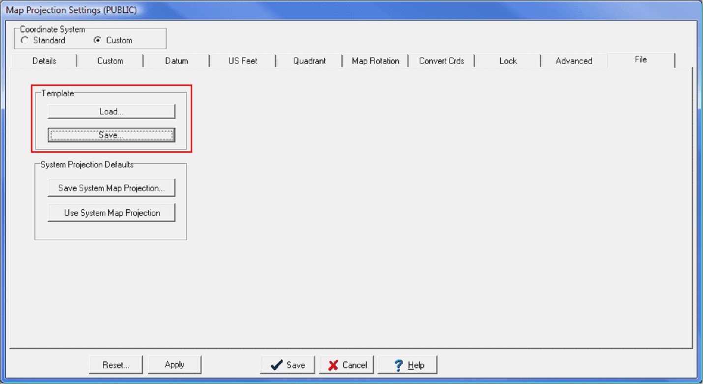 The File tab saves specific map projections and establishes a default map projection for all new projects. The best time to set a project's map projection is at the very beginning. A default projection ensures all new projects system-wide will automatically use one predefined map projection. Map Projection Templates simply store the settings of the currently saved map projection in an external *.MPT file. Setting a default projection can be useful for companies or field offices that are focused on a specific basin where one map projection is always applicable. Especially when using a non-standard custom projection, template files are useful for making backups of Petra map projections as well as quickly copying the map projection from one project to another.