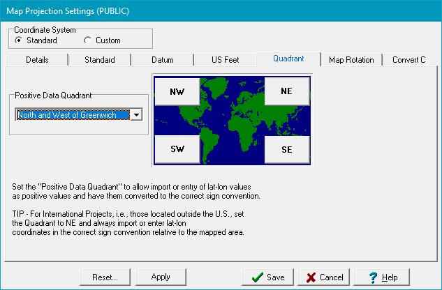 Quadrants and LatLon SignsDespite the convention, LatLon points (particularly in North America) are prone to being reported as having positive longitudes when they should be negative. This error can cause overlay data to grossly misalign, and to effectively flip the east and west sides of the map. A mix of correctly and incorrectly formatted LatLons will strand some data literally in the next hemisphere. Using the Quadrant tabThe Quadrant tab automatically converts incorrect positive LatLon values to the correct negative values for the selected quadrantduring import. This is primarily used for projects in North America, where longitude values are commonly incorrectly reported as positive. Selecting the NW quadrant, for example, will convert all incoming positive longitude values to the correct negative longitudes, where the incorrect (+29.97, +95.35) would convert to a correct (+29.97, -95.35). Most latitude and longitudes for the rest of the world are reported correctly. As such, users working on international projects should select the NE quadrant. This quadrant, being north of the equator and east of the Prime Meridian, has both positive latitudes and longitudes. When this quadrant is selected, no correction is made. |
