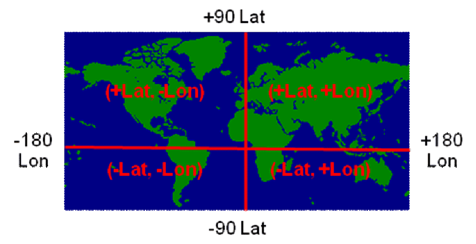 BackgroundThe spherical surface of the Earth is divided by east-west running lines of latitude and north-south running lines of longitude. The equator that defines 0∨dm; latitude is defined as the plane perpendicular to the Earths axis that also contains the Earths center of mass. The Prime Meridian that defines 0∨dm; longitude is a arbitrary line that runs through the Royal Observatory in Greenwich, London. By convention, the equator is 0∨dm; latitude, with +90∨dm; at the North Pole and -90∨dm; at the South Pole. The Prime Meridian is 0∨dm; longitude with positive longitude to the east and negative longitude to the west. The equator and the Prime Meridian therefore divide the Earth up into four quadrants. The signs of latitude and longitude distinguish between the four qquadrants. Western Europe, Russia, China, and the Middle East have positive latitude and longitude. North America, on the other hand has positive latitudes and negative longitudes. As an example, (+29.97, -95.35) is Houston, TX, while (+29.97, +95.35) is Byai Zhen near the Tibet-India border.