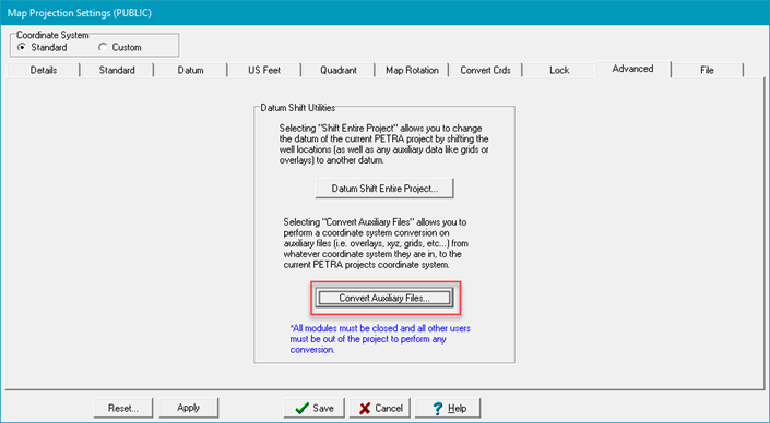 1. From the Map Projection Settings Advanced tab, Click Convert Auxillary Files...button.