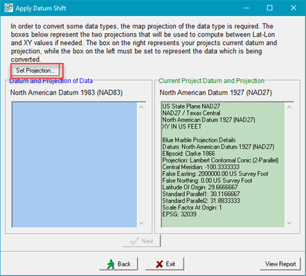 1. The datum comparison dialog opens with the current datum and projection populated, Click Set Projection.